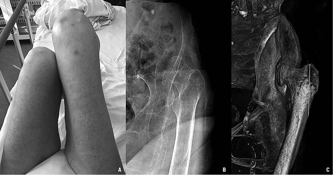 En 83-årig dement, kvindelig plejehjemsbeboer blev fundet siddende på gulvet og var vanskelig at mobilisere. Vagtlægen havde mistanke om et hoftenært knoglebrud og henviste patienten til skadestuen. Den objektive undersøgelse viste et forkortet venstre ben uden udadrotation (A), ingen ømhed og næsten normalt bevægeomfang. Røntgenundersøgelse og CT viste en kronisk lukseret, dysplastisk hofte med caputnekrose og dannelse af et falsk hofteled (B, C). Den praktiserende læge og de pårørende kunne efterfølgende oplyse, at patienten altid havde haltet, men aldrig var blevet udredt herfor.