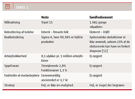 Primære mål for Vestas og Sundhedsvæsnets kvalitetsmodel