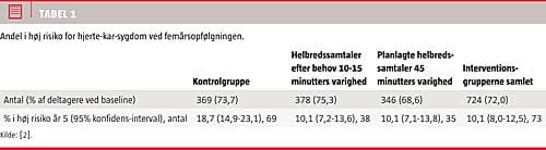 For det andet er der meget spændende, og efter min opfattelse upåagtede, observationer i Ebeltoftundersøgelsen (Tabel 1). To interventionsgrupper, en lavdosis- og en højddosisinterventionsgruppe, rykkede sig lige meget i risikoprofil for hjerte-kar-sygdom i forhold til kontrolgruppen, og det er almenmedicinsk set yderst interessant.