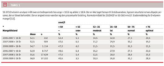 SST anfører endvidere følgende: »Der er ikke indikation for at måle D-vitamin-status hos i øvrigt raske personer. Det gælder også for patienter med træthed og uspecifikke gener fra bevægeapparatet, såfremt de har en almindelig sund livsstil (soleksposition, fiskeindtag og evt. vitaminpille), idet sandsynligheden for, at de har symptomgivende D-vitamin-mangel er meget lille«. Hverdagen er anderledes i den daglige klinik end man opfatter det i SST. Ud fra de i Tabel 1 anførte 56.973 D-vitamin-analyser, der er foretaget på Vejle Sygehus i årene 2006-2009 ses, at 5% af raske unge og voksne havde haft D-vitaminniveau < 12 nmol/l, dvs. svær D-vitamin-mangel, og ca. 18% havde behandlingskrævende D-vitamin-mangel < 25 nmol/l. Det betyder, at ca. hver femte dansker har moderat til svært nedsat D-vitaminniveau, hvilket næppe kan kaldes en meget lille sandsynlighed. Der er i resultaterne ikke taget hensyn til årstidsvarationer, anden etnisk baggrund, kost, vægt eller underliggende sygdom, som kan have betydning for behandling med D-vitamin.