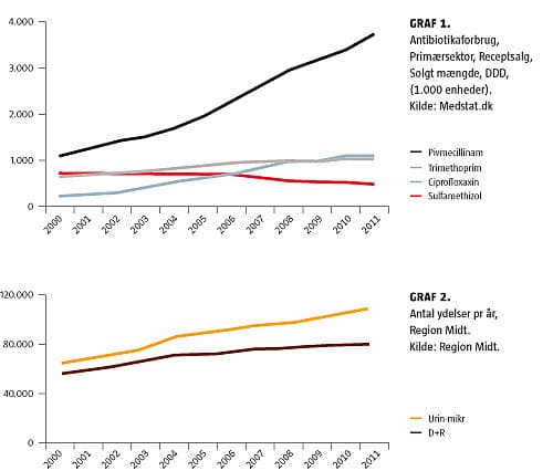 Emnet er vigtigt, fordi behandling af blærebetændelse samlet (kompliceret + ukompliceret) nu andrager en noget større andel af vores ordinerede antibiotikaforbrug end for ti år siden. Af Graf 1 fremgår det desuden, at forbruget af pivmecillinam er fordoblet, mens forbruget af ciproxin er tredoblet de seneste ti år.