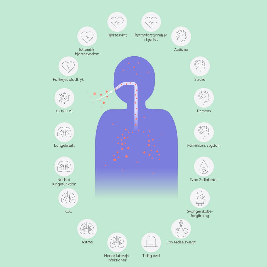 Sammenhængen mellem luftforurening og alvorlige sygdomme er veldokumenteret, og evidensen er blevet styrket betydeligt de seneste år. Det står i dag klart, at luftforurening – også ved relativt lave koncentrationer – øger risikoen for en lang række sygdomme. Det gælder bl.a. astma hos børn og voksne, nedre luftvejsinfektioner og autisme hos børn samt KOL, forhøjet blodtryk, iskæmisk hjertesygdom, stroke, type 2-diabetes, lungekræft, demens hos voksne og for tidlig død som følge af flere af disse sygdomme. Luftforurening blev i 2023 estimeret til at forårsage omkring 3.280 for tidlige dødsfald i Danmark [3].