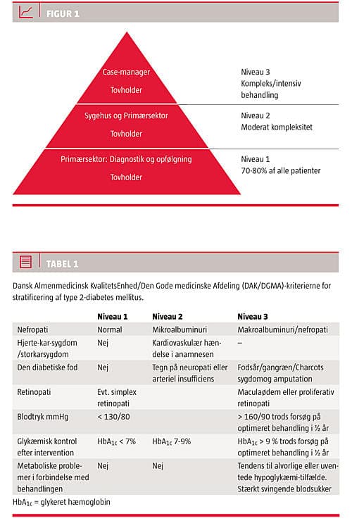 Med udgangspunkt i denne tankegang udarbejdede man i det daværende DAK-projekt og DGMA (Den Gode Medicinske Afdeling) i 2006 et sæt kriterier for stratificering af bl.a. type 2-diabetes mellitus (T2DM)-patienter på de tre niveauer, hvilket har haft stor indflydelse på udformningen af regionernes forløbsprogrammer. Spørgsmålet er: Kan disse kriterier anvendes til beskrivelse af en hensigtsmæssig arbejdsdeling mellem sektorerne, og giver de pyramidefordelingen?