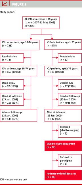 In the primary study population (ICU patients ≥ 75 years), 37 ICU-survivors were eligible for interview. A single patient refused to participate, but the remaining 36 elderly ICU survivors completed the investigation with full data (inclusion rate of 97% (95% CI 92-100)).