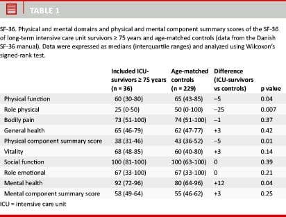 In comparison with an age-matched Danish background population, the elderly ICU survivors scored significantly lower in two of four physical domains and in the physical component summary score (Table 1). In contrast, the elderly ICU survivors scored significantly higher in the domain of mental health compared with general population controls. In the remaining three mental domains and the mental component summary score, the elderly population did not differ from controls (Table 1).