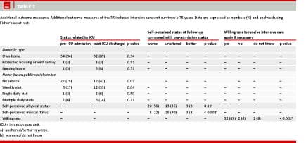 The limitations of the present study include the single-centre setting and the relatively small group of elderly ICU survivors eligible for an interview. Given these limitations, a more definitive study should be performed including patients from multiple centres and countries, multiple HRQOL-analyses at three, six and 12 months and cost-effectiveness analyses.