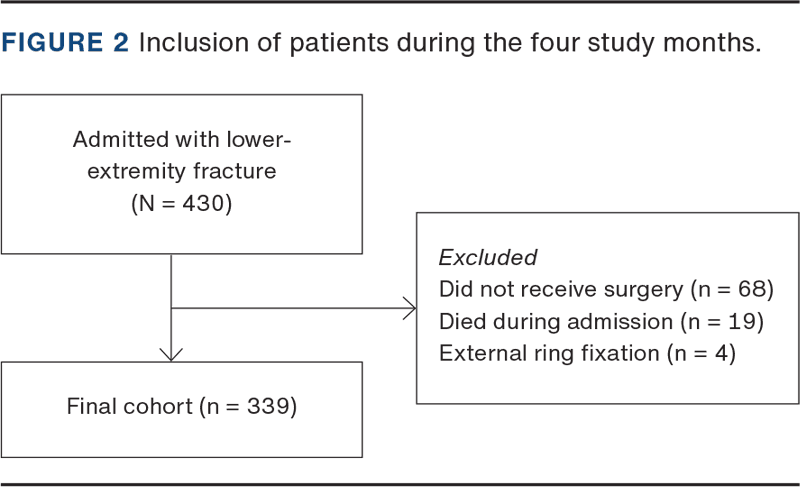 A total of 430 patients were admitted with a primary lower-extremity fracture in the four-month inclusion period. However, 68 did not receive surgery, four were treated with external ring fixation and 19 died during hospitalisation (Figure 2).