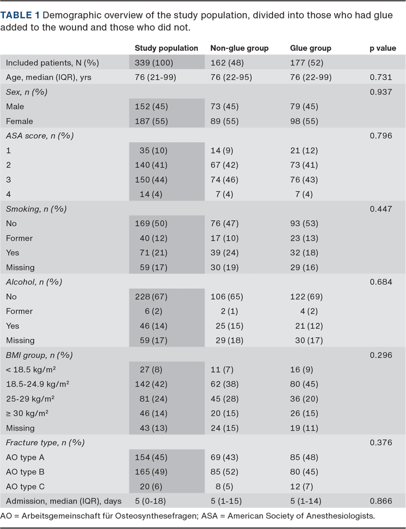 A total of 339 patients were included in the final cohort; 162 were treated without glue and 177 had glue added (Table 1). The median age was 76 (range: 16-100) years; 55% were females. The predominant fracture was of the femur. No statistical differences were found between the glue or non-glue group regarding age, sex, comorbidity, smoking, alcohol, BMI, fracture classification, ASA score or length of admission.