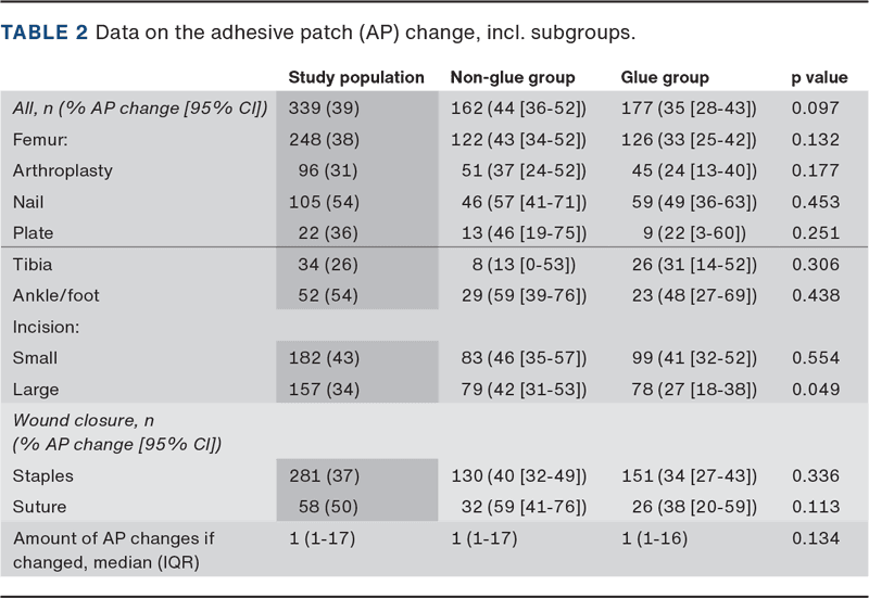 RESULTS. Among 339 patients, 162 received no glue and 177 received glue. The median age was 76 years, 55% were female and femoral fractures predominated. Groups were comparable at baseline. AP change occurred in 44% without glue and 35% with glue (p = 0.097). For large incisions, AP change was 42% without glue versus 27% with glue (p = 0.040). No differences were found by fracture location, surgery type or closure method.