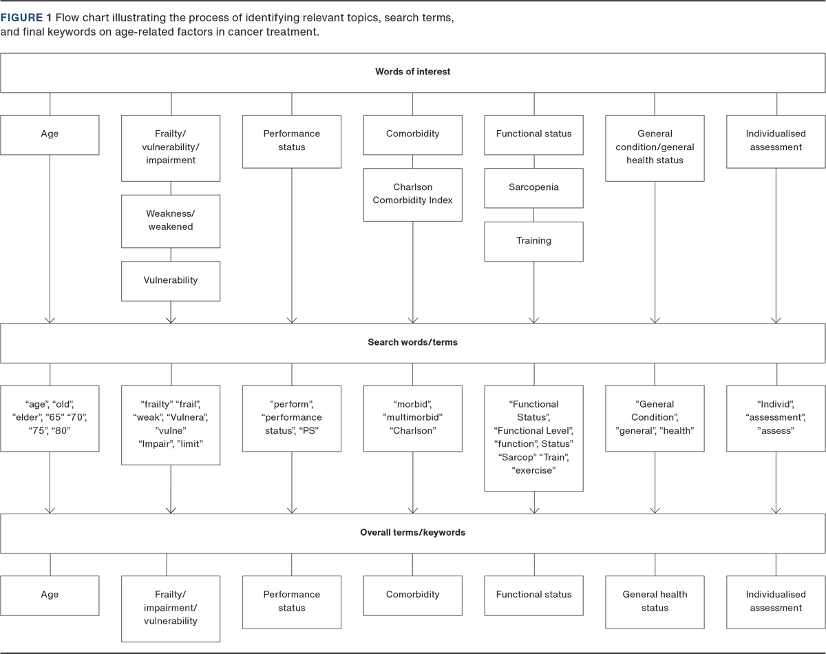 To assess the extent to which guidelines addressed the unique needs of older patients, a systematic approach was adopted. Initially, a gross list of relevant keywords and abbreviations was compiled for a systematic search (Figure 1). The list was then reviewed and approved by an expert panel comprising clinicians from relevant specialities (geriatric, oncology and surgical specialities). Final refinement and validation of the search list was conducted by two clinicians independently, who evaluated selected cancer guidelines using the developed search list. Specific keywords or search terms were then modified, deleted or added to ensure comprehensive coverage of the following domains before use: age, frailty, performance status, comorbidity, functional status, general health status and individual assessment.
