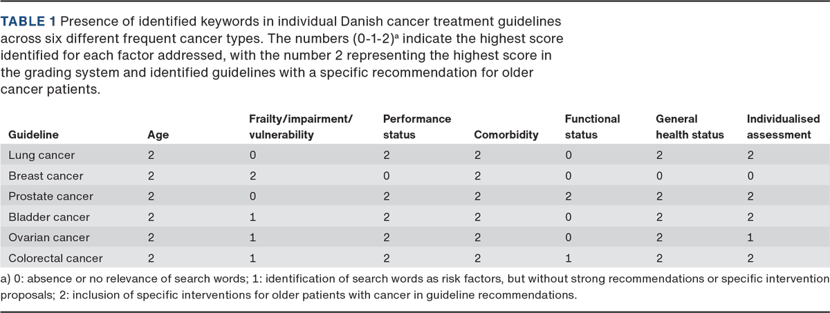 Structural screening for frailty and impairments to uncover the need for geriatric interventions is recommended by international societies. However, no such screening is implemented in Denmark or included in the Danish cancer guidelines. A newly published SIOG review highlights the limited representation of geriatric oncology also in other European cancer guidelines [14]. A Danish consensus on screening tools is needed to describe the consequences of identified frailty and detail recommended handling. A CGA might not be available at all cancer centres and would require a much larger number of geriatricians. Instead, GA-identified impairments could also be handled by the patients' general practitioner or cancer-treating departments. A challenge remains in defining actionable cut-offs and determining the consequences of identified vulnerabilities. CGA does not provide clear-cut thresholds for treatment modification, but could be a tool to facilitate individualised optimisation and guide shared decision-making.
