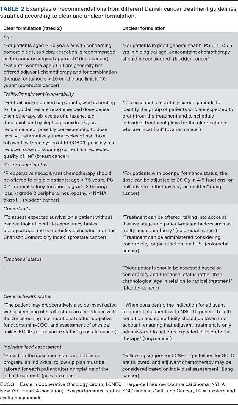 Although we identified recommendations related to selected keywords, many were vague and open for interpretation, e.g., “Treatment can be offered taking into account disease stage and patient-related factors such as frailty and comorbidity” (colorectal cancer). This recommendation does not provide the clinician with specific guidance, making it difficult to translate into practical use in everyday clinical work. A list of more detailed considerations would be useful.