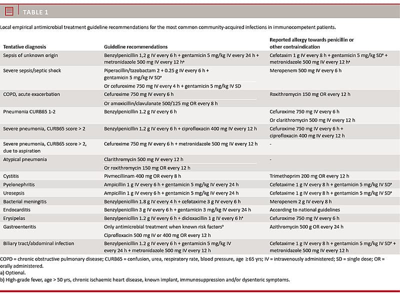 Antibiotic use was documented and categorised by dosage as appropriate or not, and the guideline adherence as “guideline-concordant” or “guideline-discordant”. Guideline-concordant treatment was defined as empiric therapy in accordance with the clinical diagnosis based on signs and symptoms and the local antimicrobial guideline (Table 1). A complete medical chart review was undertaken in case of guideline-discordant therapy in order to appraise the reasons for the decision.