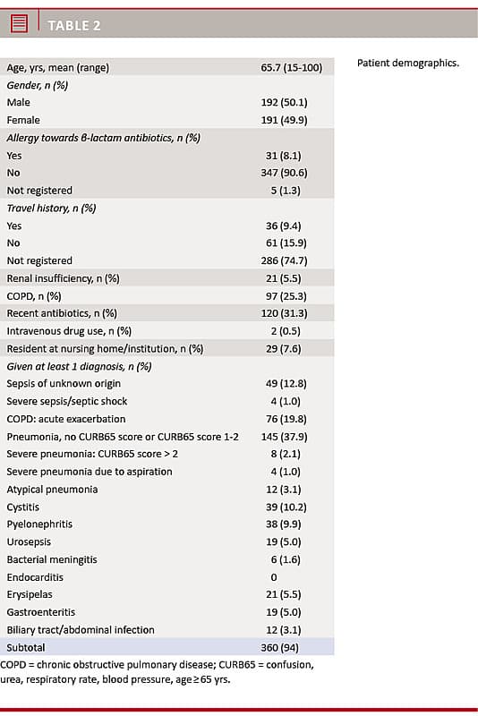 We used a structured data collection form to record information on gender, age, comorbidity, intravenous drug abuse, β-lactam allergy, travel history, antibiotic prescriptions within the past four weeks prior to hospital admittance, and permanent residence in a nursing home or similar institution. We registered data on whether leucocyte counts and C-reactive protein (CRP) levels were available to the treating physician before prescription of antibiotics.