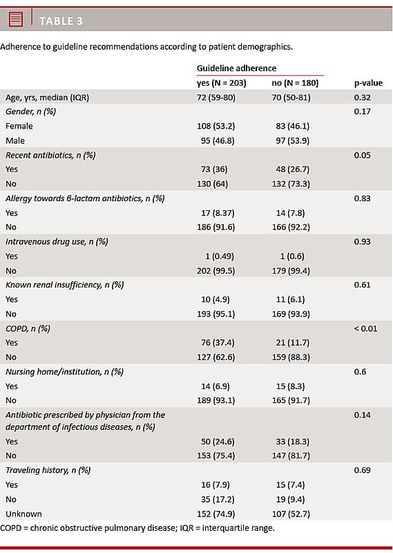 There was no difference in concordance according to the patients’ demographics, except for patients with COPD who were more likely to receive guideline-concordant treatment (83%, p < 0.01). Treatment for suspected sepsis of unknown origin (49 patients) was guideline-concordant in 41% of cases. Approximately half of the prescriptions were guideline-concordant in 169 patients (44% of the patients included) who were treated for suspected community-acquired pneumonia with no significant difference by CURB65 score or suspicion of