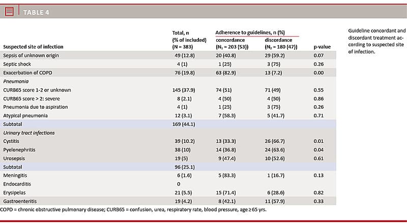 The antibiotic prescriptions were guideline-concordant in 203 patients (53%). The most commonly suspected infections were pneumonia (44%), urinary tract infection (25%) and exacerbation of chronic obstructive pulmonary disease (COPD) (20%).