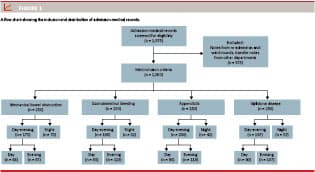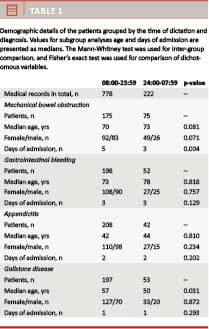 In total, 1,375 medical records were scanned for inclusion, of which 1,000 met the inclusion criteria. The included medical records consisted of 250 of each of the four diagnoses: mechanical bowel obstruction, gastrointestinal bleeding, appendicitis and gallstone disease. The medical records were divided into two groups (day- and evening time and night time, respectively) based on time of dictation. Day- and evening-time was defined as 08:00 to 23:59 hours, and night-time was defined as 24:00 to 07:59 hours. A flowchart of the inclusion and distribution of admission medical records is presented in Figure 1.