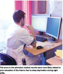 Night time deterioration was not seen in the quality of medical records; yet, consistent errors were found across day and evening time and night time in several categories. The errors were more likely related to poor education of the interns than to sleep deprivation during night shifts.