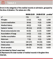 Results: A total of 1,183 errors were found in 778 admission medical records made during day- and evening time, and 322 errors in 222 admission medical records from night time shifts. No significant overall difference in error was found in the admission medical records when day and evening values were compared to night values. Subgroup analyses made for all four diagnoses showed no difference in day and evening values compared with night time values.