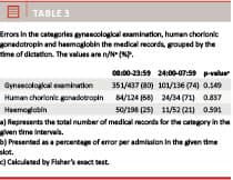 The median patient age was 64 years (573 women). Overall, patients were admitted for a median of two days. The demography of the patients grouped by diagnosis and time of dictation is illustrated in Table 1. Errors were presented as the number (percentage) in the categories of the medical records and grouped by the time of dictation in Table 2. For blood samples, a significant difference in error was found when day- and evening time values were compared with night time values (p = 0.023). As the total number of medical records (n) differed for the categories gynaecological examination (all women, n = 573), HCG (only fertile women, n = 158) and haemoglobin (n = 250), these data were presented separately (Table 3). However, no significant difference was found when errors in day- and evening time were compared with night time errors.