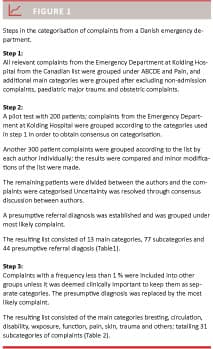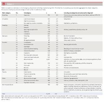 System (CEDIS) initiative developed a complaint classification based on ED compilations of complaints combined with elements from the Manchester Emergency triage. This resulted in 165 complaints grouped according to organ systems covering in-patients and out-patients [2]. Since triage of acute patients is often linked to an ABCDE (airways, breathing, circulation, disability, environment) and pain assessment of the patient, it would be of interest to evaluate if the categories of complaints fit into this approach rather than being organised according to organ system. Some triage systems assume this [6, 7], but evidence of how the chosen complaints were identified is often lacking. The aim of the present study was to establish a suitable and limited number of categories of presenting complaints based on the ABCDE and pain approach. The categories should cover the majority of all admissions in a Danish ED. A second aim was to quantify the volume of patients in each category.