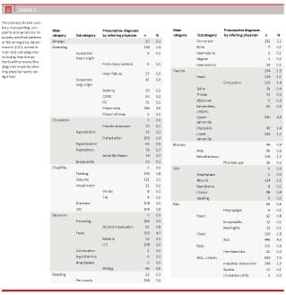 In this study, we have allocated 9,863 patients’ complaints or presumptive diagnoses into 31 different categories of complaints. Among these categories, abdominal pain, dyspnoea, fever, trauma to extremity, non-traumatic pain in extremity and chest pain covered more than 50% of the complaints.