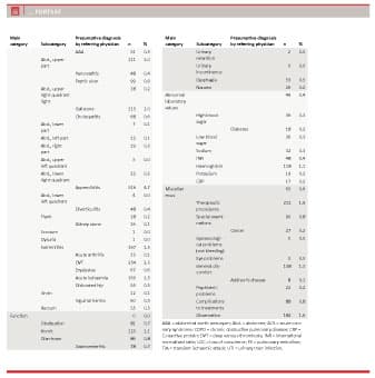 A total of 11,031 complaints were allocated to 13 main categories, 77 subcategories and 44 presumptive diagnoses. This aggregation resulted in 134 different groups with 99 groups of less than 1% (Table 1).