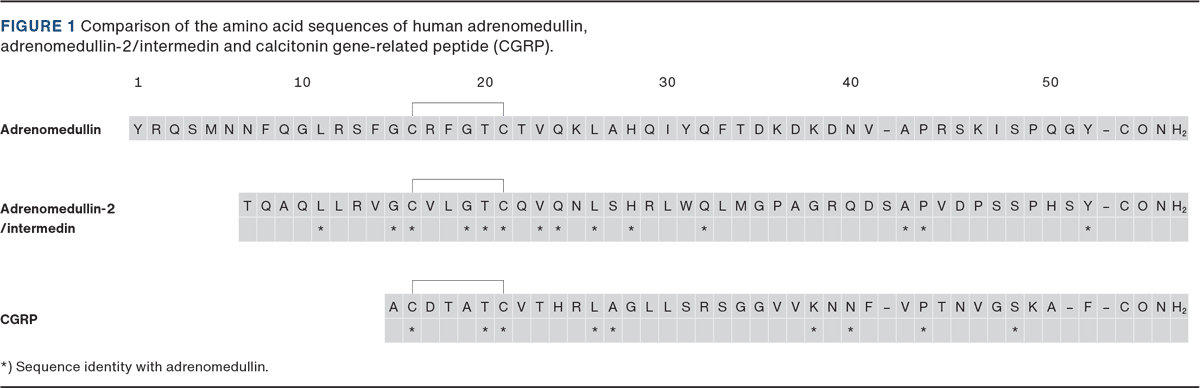 Various neurohumoral factors contribute to regulating pulmonary circulation and the pathophysiology of pulmonary hypertension (PH) [1]. Among these is adrenomedullin (AM), a potent, long-lasting, vasodilatory peptide originally discovered in human pheochromocytoma tissue [2]. AM consists of 52 amino acids with an intramolecular disulfide bond and shares slight homology with calcitonin gene-related peptide (CGRP) (Figure 1). AM expression is widely distributed in the cardiovascular system, including both vascular endothelial and smooth muscle cells [3, 4]. In addition, AM and its receptor components, which include calcitonin receptor-like receptor and receptor activity-modifying protein (RAMP)2 and RAMP3 [5], co-localise in those regions, suggesting that AM acts in an autocrine and/or paracrine fashion to exert its effects on the pulmonary vasculature [6]. The actions of AM include inhibitory effects on the proliferation and migration of vascular smooth muscle cells and collagen production by fibroblasts [7, 8]. This suggests that AM acts as an anti-proliferative, anti-migrative and anti-fibrotic factor within the pulmonary vasculature [9, 10]. In addition, AM has been reported to exert anti-apoptotic, angiogenic, anti-inflammatory and antioxidant effects [11, 12]. Therefore, AM is thought to play a protective role against the development of PH. Here, we describe the significance of AM in pulmonary circulation and PH.
