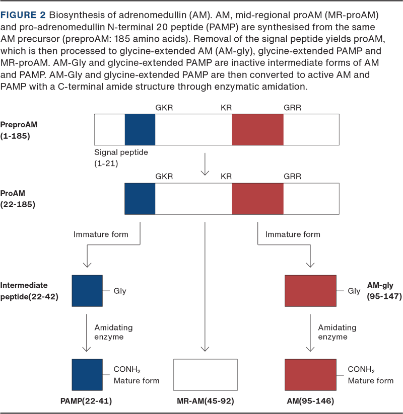 AM mRNA is translated to preproAM(1-185) (Figure 2), after which signal peptide is removed to produce proAM(22-185) [24]. AM is produced from proAM in a two-step enzymatic reaction [25]. First, proAM is cleaved to glycine-extended AM. This is followed by enzymatic amidation, which converts AM-glycine to active mature AM containing a C-terminal amide structure [25] (Figure 2). In an early study, radioimmunoassay showed that plasma AM levels were 3.3 fmol/ml in healthy subjects [2], which was confirmed by a subsequent study [26]. Thereafter, a chemiluminescent immunoassay for mid-regional proAM (MR-proAM) was developed [27] (Figure 2). MR-proAM is inactive and stable. Consequently, plasma MR-proAM levels are about 20-30 times higher than plasma AM levels. In general, sex, age and circadian variation do not affect plasma AM levels [28]. Although expression of AM mRNA and peptide is widely distributed in various tissues, the main source of plasma AM is now thought to be the vasculature [29] as AM mRNA is more prominently expressed in vascular endothelial and smooth muscle cells than in the adrenal gland [3, 4].