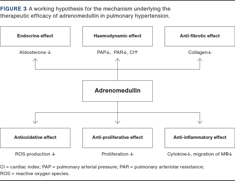 Because AM receptors are abundantly expressed in the pulmonary vasculature, AM exerts a strong pulmonary vasodilatory effect. The pulmonary vasodilation induced by AM is mediated in part via nitric oxide. Plasma AM levels are increased in proportion to disease severity in patients with PH, making plasma AM a potential prognostic indicator in PH. Acute intravenous administration or inhalation of AM improves pulmonary haemodynamics in patients with PH. Moreover, chronically administered or inhaled AM and AM gene delivery exert protective effects against the development of PH. Thus, AM levels are closely related to the pathophysiology of PH and may be a promising therapeutic target for treatment of PH. A working hypothesis for the possible mechanism by which AM exerts its effects on PH is shown in Figure 3. Thus, AM has pleiotropic effects (Figure 3), and therapeutic applications of AM have been attempted in many conditions, including PH. Currently, large cohort studies are being conducted for inflammatory bowel disease and cerebral infarction [49-52]. For clinical application of AM, development of derivatives with a longer half-life is also currently underway to improve the short half-life of AM [53].