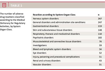 The total number of ADRs listed in the 484 reports was 1,461. Overall, the most frequently reported symptoms were nausea (n = 37), decreased appetite (n = 33) and dyspnoea (n = 32).