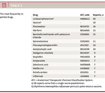 The reports concerned 285 unique drugs. The most frequently reported drugs are shown in Table 3.