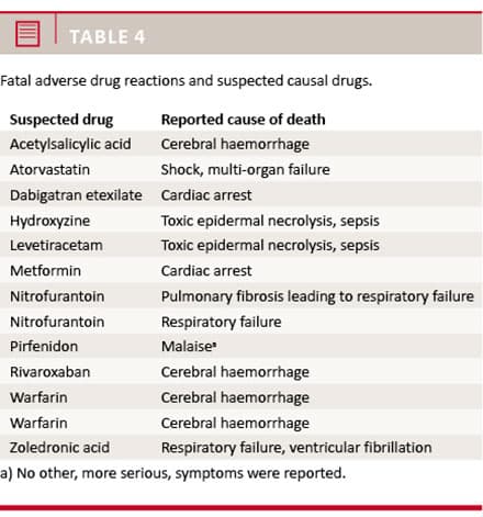 The proportion of fatal ADRs was 13/484 (2.7%) (Table 4). In four of these cases, the suspected drug was an anticoagulant. Cerebral bleeding was the ADR reported in three cases. Two fatal events were caused by nitrofurantoin due to respiratory failure.