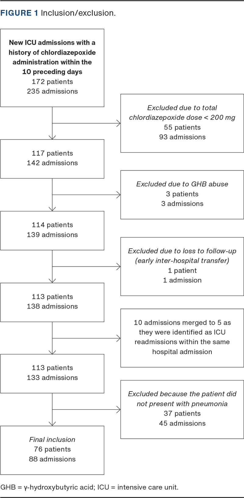 The data used in this study originate from a study on respiratory failure requiring mechanical ventilation among patients receiving chlordiazepoxide for AWS [12]. Patients were included over approximately 3.5 years, from 1 June 2017 to 31 December 2020. Patients were identified in the hospital’s electronic health record (EHR) system, and data were entered in a REDCap (Vanderbilt University, Nashville, USA) database. All inpatient records on patients admitted to the ICU (regardless of diagnosis) involving any chlordiazepoxide administration within ten days prior to ICU admission were identified. Only admissions with administration of at least 200 mg of chlordiazepoxide and presenting symptoms of pneumonia were included in this study (Figure 1). Pneumonia was defined at the discretion of the treating ICU physician based on their clinical judgment.