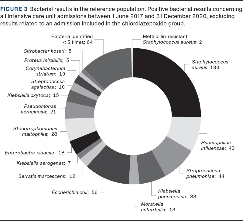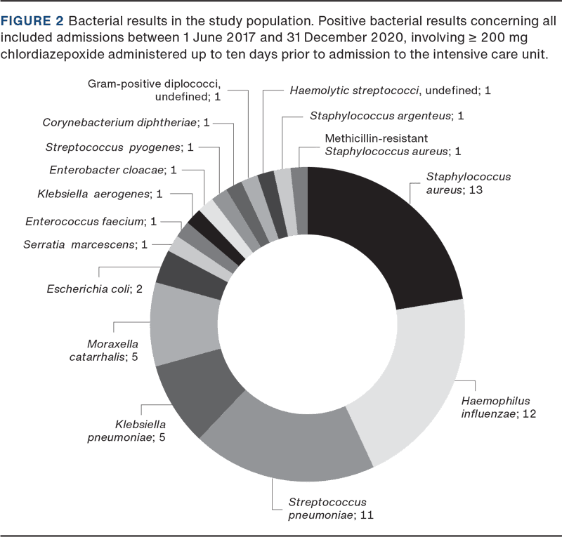 Our results revealed that most infections were caused by gram-positive bacterial infections, predominantly S. aureus and S. pneumonia, whereas the gram-negative bacteria H. influenzae, Klebsiella pneumoniae and Moraxella catarrhalis accounted for slightly more than a third of infections in ICU patients treated with chlordiazepoxide for AWS, displaying clinical symptoms of pneumonia. Comparing the chlordiazepoxide group with the overall department microbiological results, we found no difference in S. aureus prevalence. However, S. pneumoniae, H. influenzae and K. pneumoniae were considerably less prevalent in the overall department population.