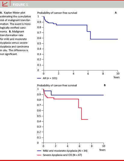 Results: Among the 101 patients, 18 (18%) were diagnosed with mild dysplasia, 16 (16%) with moderate dysplasia, 35 (35%) with severe dysplasia and 32 (32%) with carcinoma in situ (CIS) at the initial examination at OUH. Fifteen patients (15%), all males, developed invasive cancer. Among these, one patient was initially diagnosed with mild dysplasia, one with moderate dysplasia, seven with severe dysplasia and six with CIS. In 11 of the 15 patients (73%), cancer occurred within one year from the time of diagnosis of the precancerous lesion, whereas four cancers occurred years later.