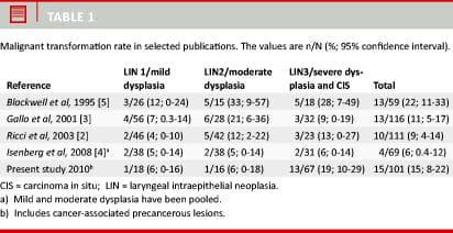 Comparing the present data with those reported by others is complicated since there are several systems of histological classification. We used the WHO classification. However, the most popular classification system in recent literature is laryngeal intraepithelial neoplasia (LIN) introduced by Friedmann et al in 1986 [14]. The LIN classification system corresponds to that applied in dysplastic lesions of the uterine cervix. Staging thus distinguishes between keratosis without dysplasia (KWD), keratosis with mild dysplasia (LIN 1), keratosis with moderate dysplasia (LIN 2), and keratosis with severe dysplasia or carcinoma in situ (LIN 3) [3]. Arguments for applying LIN include the fact that lesions characterized as KWD have been shown to be associated with an increased risk of invasive carcinoma development [4], and that the prognosis for severe dysplasia and CIS are similar [15]. The WHO and LIN classification systems are comparable despite their differences. Table I shows the data reported in the latest literature. KWD is left out of the comparison as it does not form part of the WHO classification.