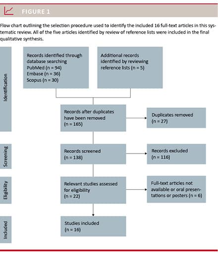 Through database and reference list searching, 165 articles were identified (Figure 1). The search results from each database were imported into the reference manager programme Mendeley, and 27 duplicates were automatically removed. Therefore, 138 articles were the starting point for the analysis. By reviewing titles and abstracts, 22 papers fulfilled the inclusions criteria and were eligible and relevant for this analysis. A total of six studies were excluded from the systematic analysis because only their abstracts were available. Thus, 16 full text articles remained for analysis.