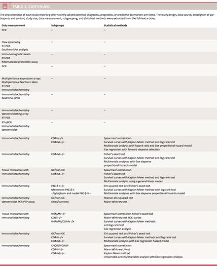 When considering the expression of potential prognostic or predictive biomarkers in the identified studies, a predominance of studies reporting alternatively spliced variants of CD44 were observed. Several studies describe that the alternative splicing of CD44 was significantly correlated with clinically accepted prognostic staging methods such as Ann Arbor Stage and IPI in DLBCL [13, 35, 37-40].