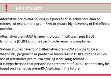 This systematic review aimed to evaluate alternative pre-mRNA splicing as clinically useful diagnostic, prognostic or predictive biomarkers in DLBCL by evaluating the strength and limitations of the study design, the evidence level, the potential sensitivity and specificity, and the potential contribution to personalised medicine.