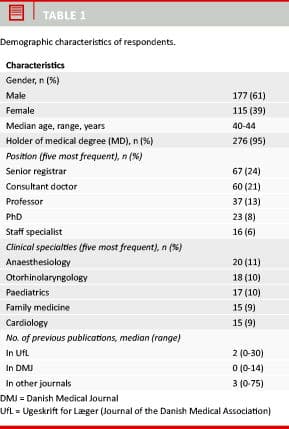 The questionnaire was e-mailed to 470 corresponding authors and 292 responded (62%). Not every author answered every question; thus, response rates for individual questions differ. The total number of respondents is given for each question. The demographic characteristics of the respondents are provided in Table 1.