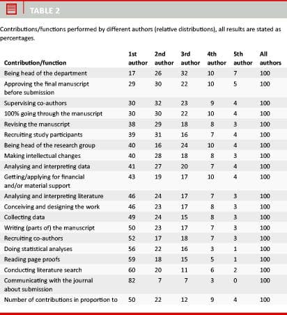 Respondents declared what contributions/functions they and their co-authors had performed in relation to the published article (box ticking of predefined categories) (Table 2). It was calculated how often a specific contribution/function was performed by first authors, second authors, etc. (relative distributions). All except three contributions/functions were most often performed by first authors. Manuscript approval and co-author supervision were most often performed by second authors. Being head of the department was most often "performed" by the third authors (see Table 2).