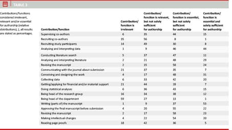 Respondents indicated what (predefined) contributions/functions they found irrelevant, relevant and/or essential for authorship (Table 3). "Being head of the department" was the contribution/function considered irrelevant by most respondents. "Writing (parts of) the manuscript" was the contribution/function considered essential and sufficient for authorship by most respondents.