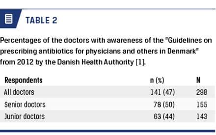 A questionnaire was developed in cooperation with a group of experts on questionnaire design. In order to check the comprehension and clarity of the questions, the questionnaire was pilot tested. Two rounds of interviews were conducted; in total we interviewed ten doctors. The questionnaire collected information on the awareness and the perceived usefulness of “Guidelines on prescribing antibiotics for physicians and others in Denmark”. Data were also collected about the respondents‘ current speciality and employment. Data were