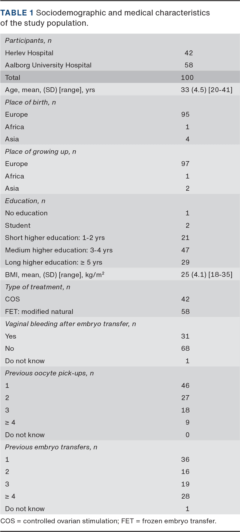 A total of 230 women were invited to participate; 78 declined, 26 did not participate due to cancelled blastocyst transfer, and one withdrew her informed consent. The questionnaire was sent to 125 women, of whom 100 completed it, yielding a response rate of 80% (Supplementary material). In all, 42 had a COS treatment, and 58 underwent a modified natural FET cycle (Table 1).