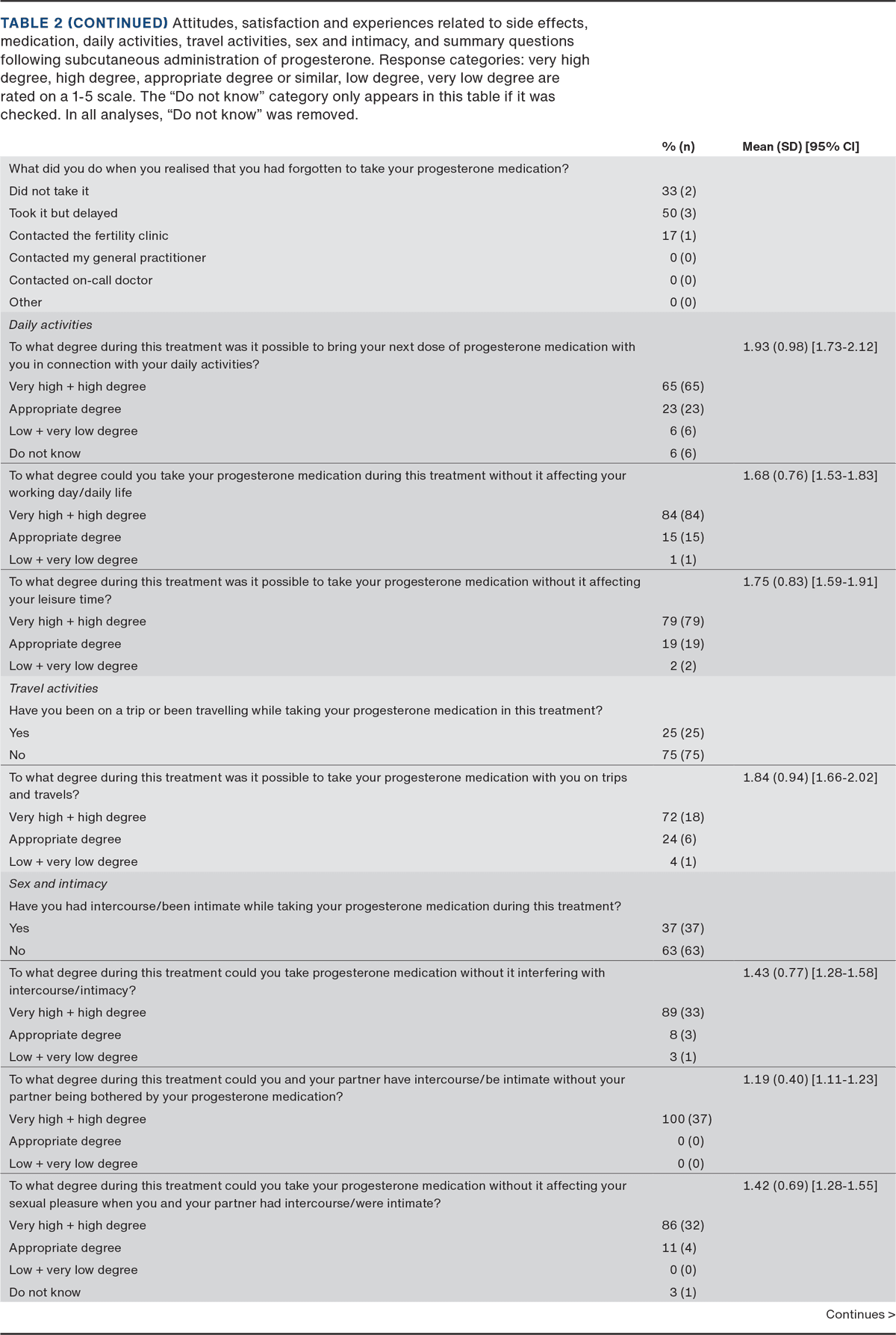The summary questions showed mean scores of 1.70-3.66, generally indicating a high degree of satisfaction with subcutaneous progesterone (Table 2).