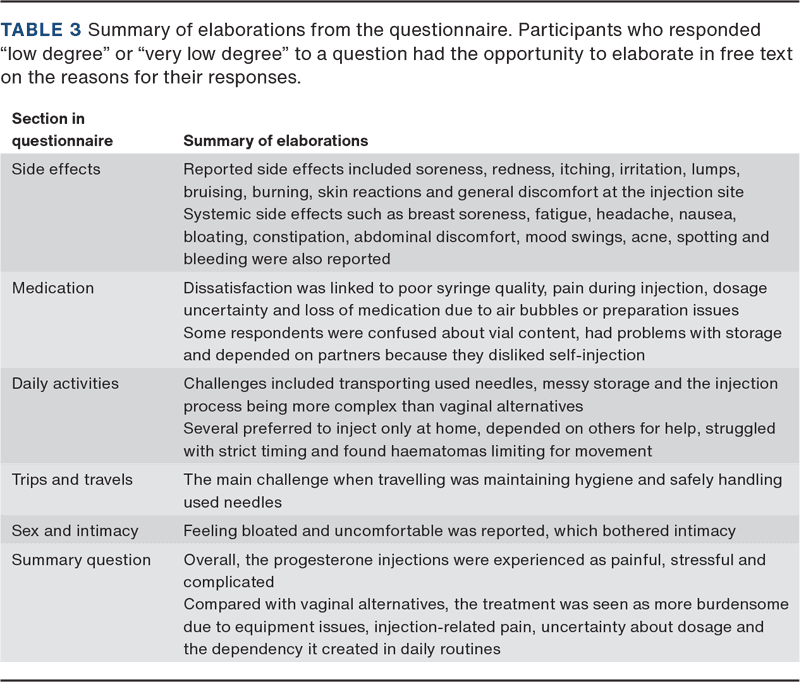A total of 37 women have had intercourse/been intimate while taking subcutaneous progesterone. One question focused on sex and intimacy: “To what degree during this treatment could you take progesterone medication without it interfering with intercourse/intimacy?” The mean score was 1.43, indicating a low degree of interference. In cases where women were not satisfied, they reported, for example, that they felt bloated and uncomfortable from the treatment (Table 2 and Table 3).