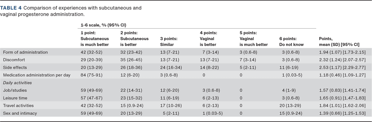 The results showed that a substantial proportion of the women were satisfied with subcutaneous progesterone administration during their current treatment compared with vaginal administration in earlier treatments. If they were given the opportunity to decide, most would choose subcutaneous administration.