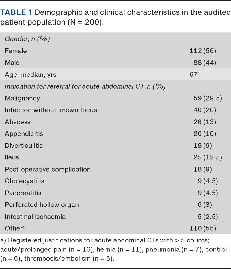 A total of 8,244 acute abdominal CTs were performed on 6,686 patients during the four-year reference period. No clinically relevant differences were found between the two audited patient subgroups from 2018 and 2022; the cohorts were therefore pooled for further analysis.