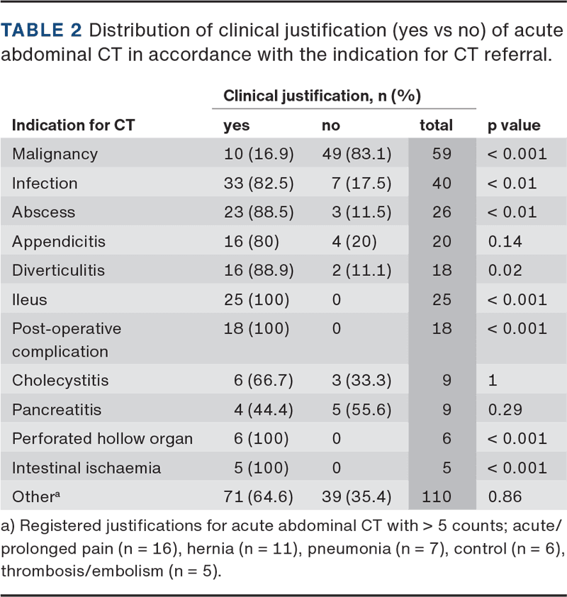 The audit teams reached a consensus that 72 of the 200 acute abdominal CTs (36.0%) were clinically unjustified. The majority of these unjustified scans (49 CT scans, 68.1%) were performed in cases with either an established or suspected malignancy. By contrast, only 12 of the 72 unjustified scans (16.7%) were associated with other clinical conditions such as infection, abscess, diverticulitis, ileus or postoperative complications (Table 2).